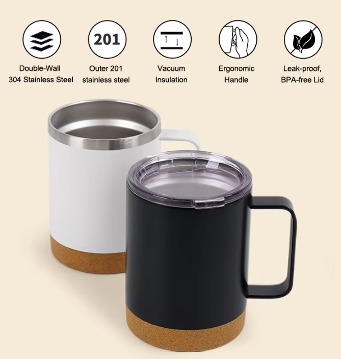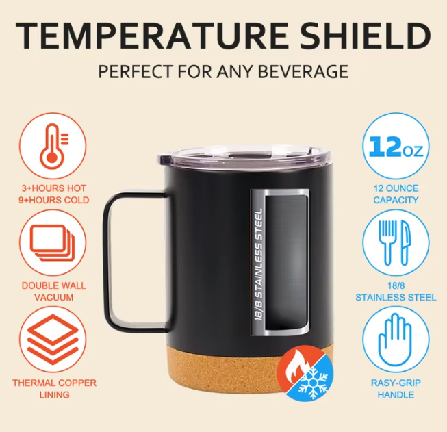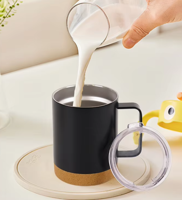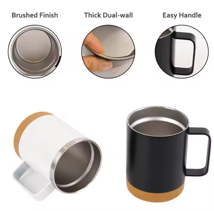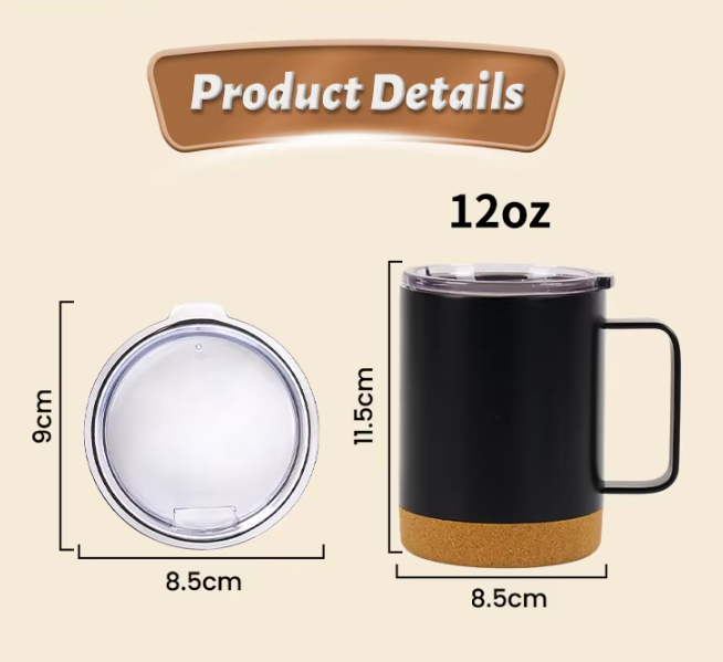 แก้วสแตนเลสทรงกระบอกมีหูจับ ฐานไม้คอร์ก รุ่น C10051 12 ออนซ์/350-360 ml